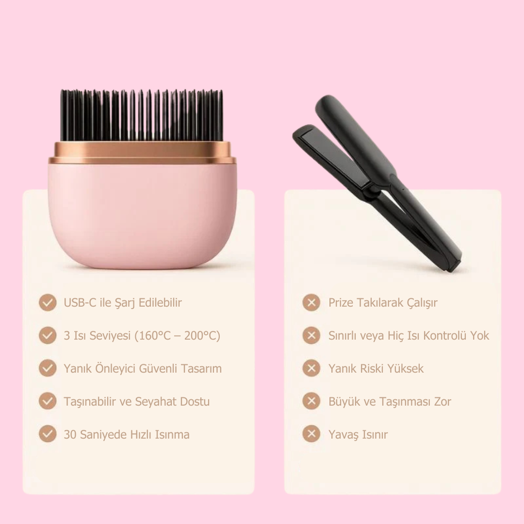Büyük düzleştiriciler yalnızca prize takılı çalışır. Bu mini düzleştirici ile USB-C şarj özelliği ve yaklaşık 60 dakika kablosuz çalışma süresi, hızlı ısınması ve taşınabilir tasarımıyla seyahat ederken veya aceleniz olduğunda bile saçlarınızı hızla şekillendirebilirsiniz.